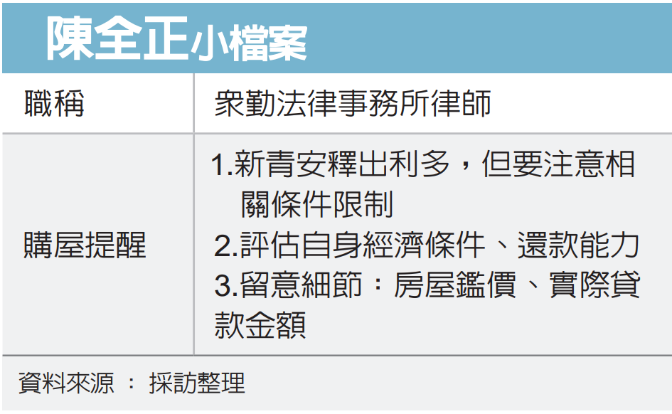 第二點,陳全正提醒,要評估自身經濟條件、還款能力,買房前先試算還款資金是否足夠。比如在雙北買房,即便有新青安貸款,但金額還是不夠;扣掉新青安之外的金額,仍必須背負傳統的銀行房貸,因為銀行不會只做新青安,因此還會涉及不同的貸款條件、還款年數跟期限。