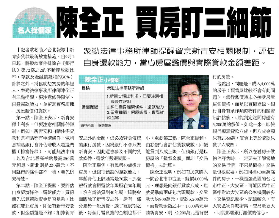 【經濟日報:名人找個家/眾勤法律事務所律師陳全正 買房盯三細節】